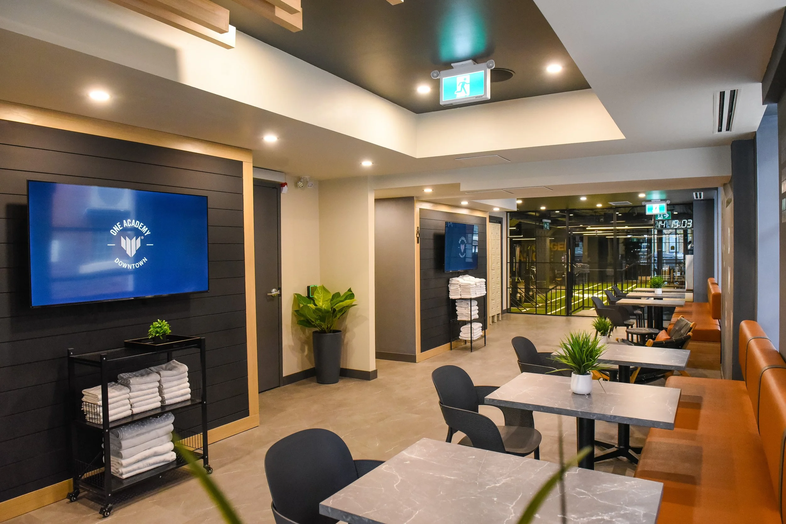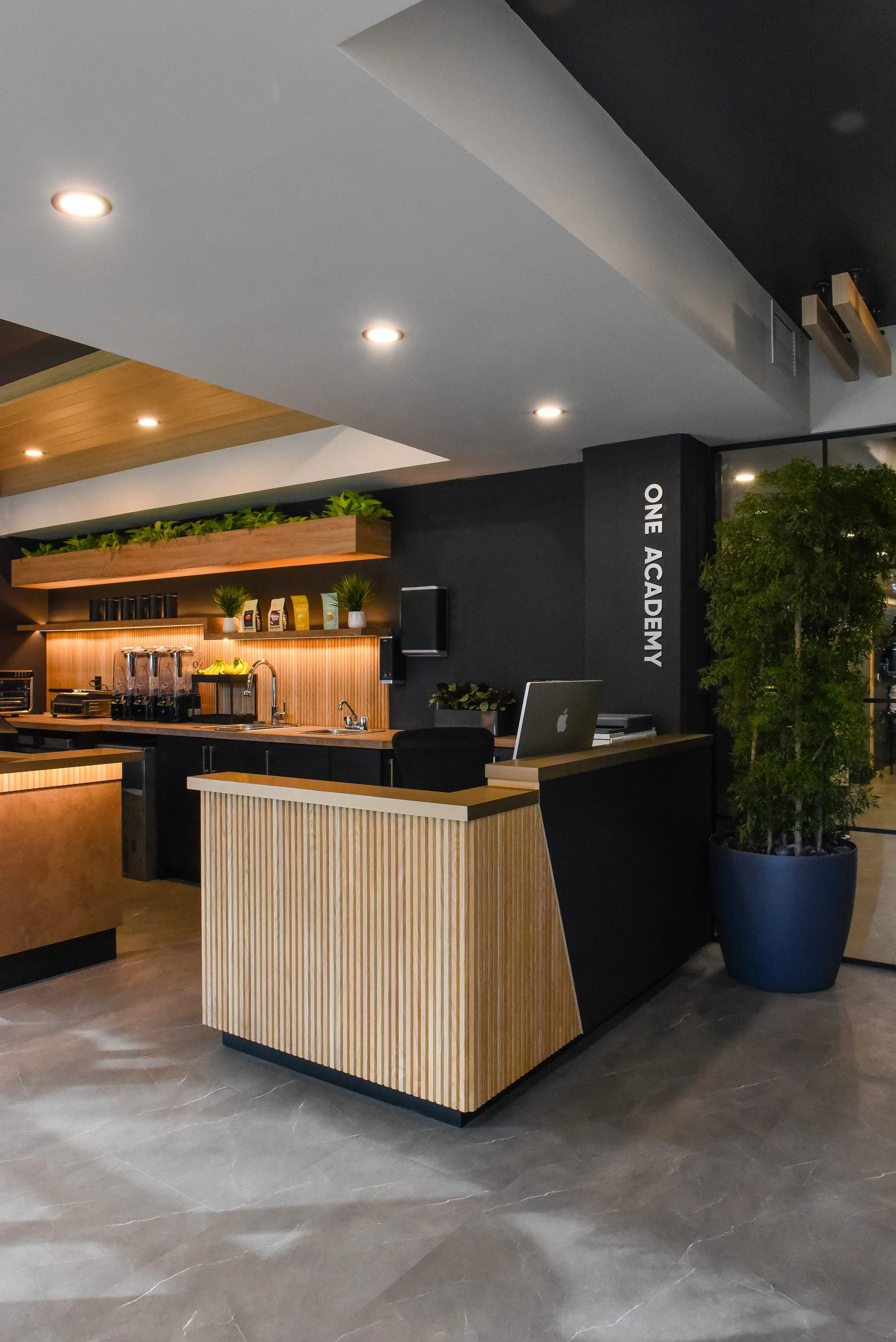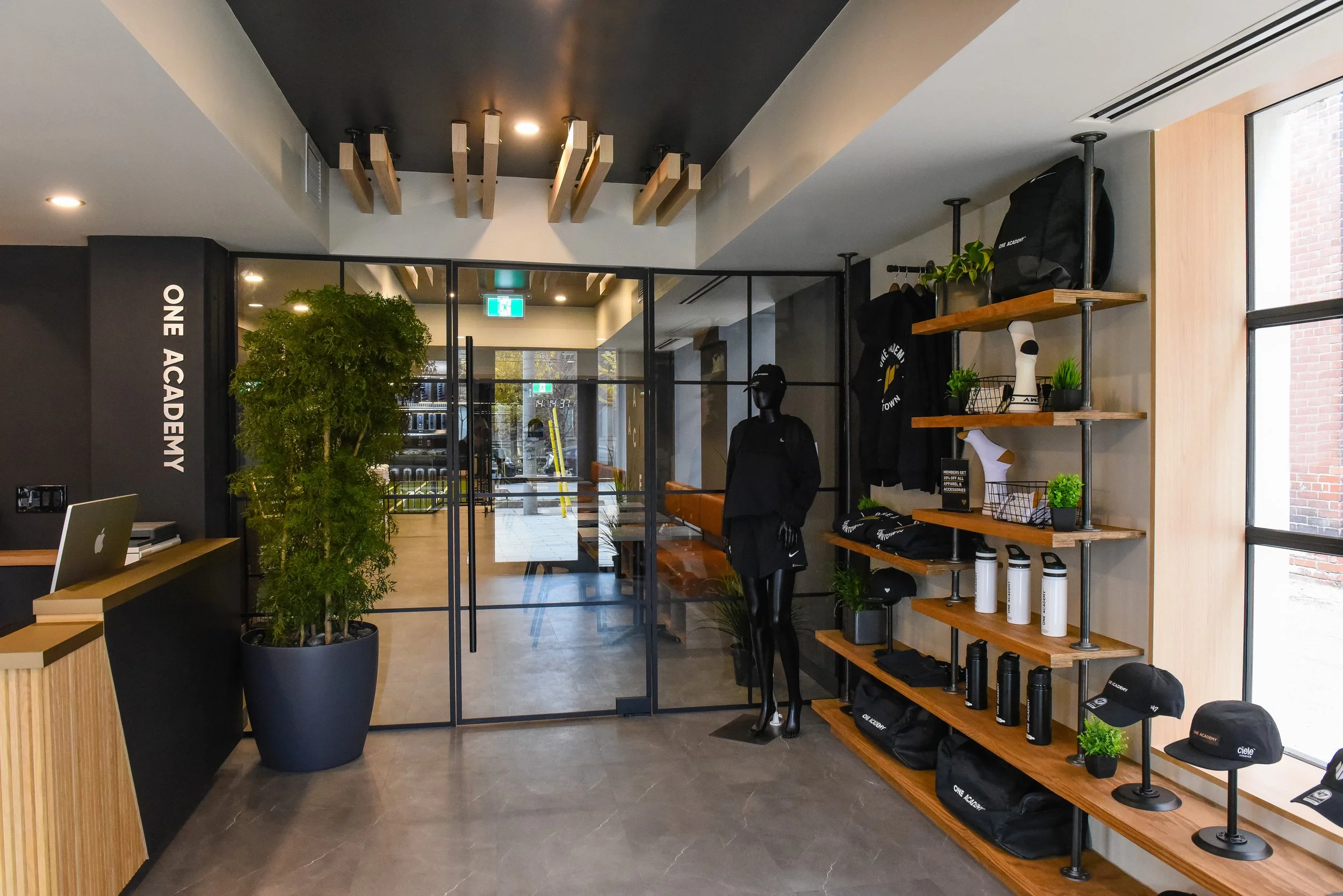 One Academy Wellington is a world-class fitness facility that seamlessly blends a café, retail shop, and guest lounge into a dynamic, community-driven environment. We established a dark yet inviting backdrop enriched with eclectic, casually curated finishes—lush greenery, metallic accents, and fluted wood—to balance industrial edge with a warm, living room feel. Careful space planning ensured intuitive guest flow from the café through the lounge, changerooms, and onto the gym floor.